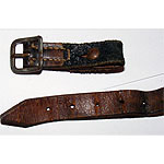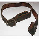 La tira corta, de 2cm. con la hebilla de clavillo cosida, sujeta a la anilla de la izquierda, mide 15cm. (mas el doblez para el cosido a la hebilla) y la más larga, 43,5cm. (ambas incluyendo el plegado para pasar por las anillas). Esta última lleva 13 perforaciones para ajustar la hebilla.